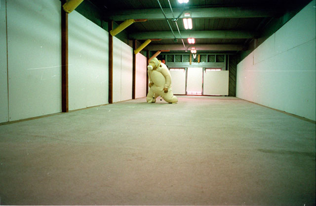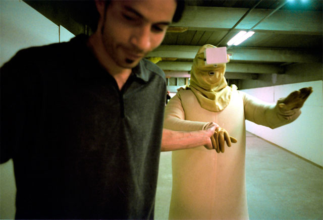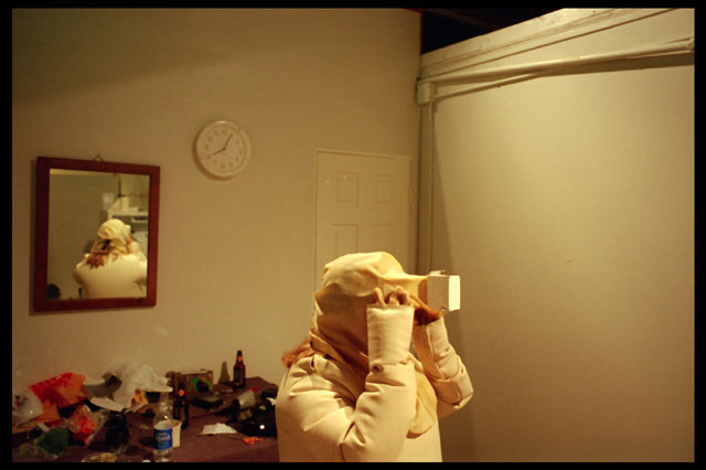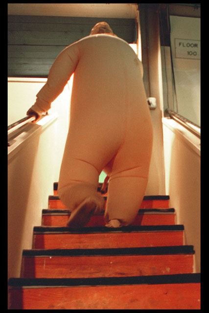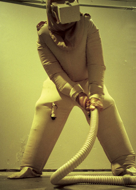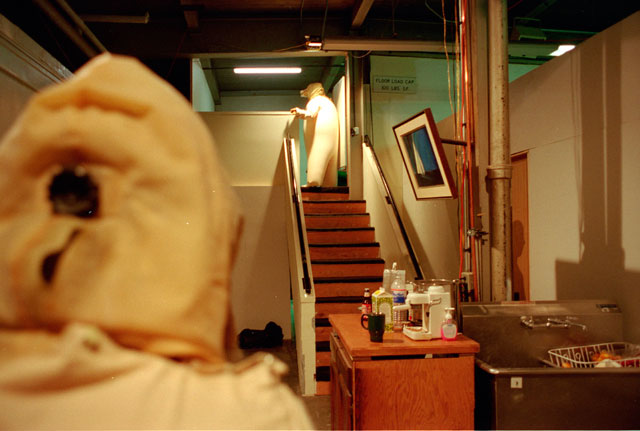 Once suited, an attendant leads the participant into the kitchen area where a LCD screen is affixed and the latex suit is inflated. The participant is then led to the attic room where three other similarly suited participants are interacting. Cameras in the kitchen and attic provide the part their only visual information.