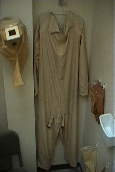 After five minutes the participant is led back to the kitchen where the latex suit is deflated and the LCD screen is removed. The participant then proceeds to the dressing room to undress.