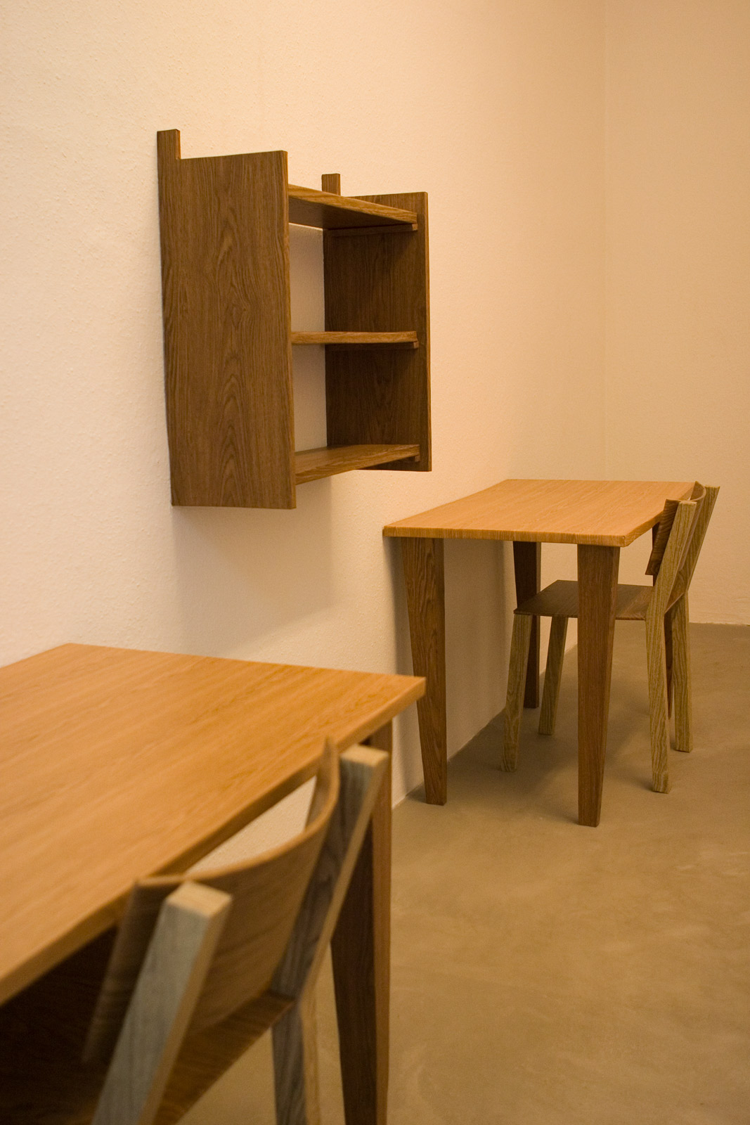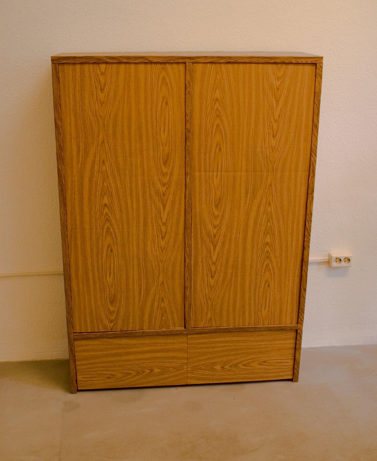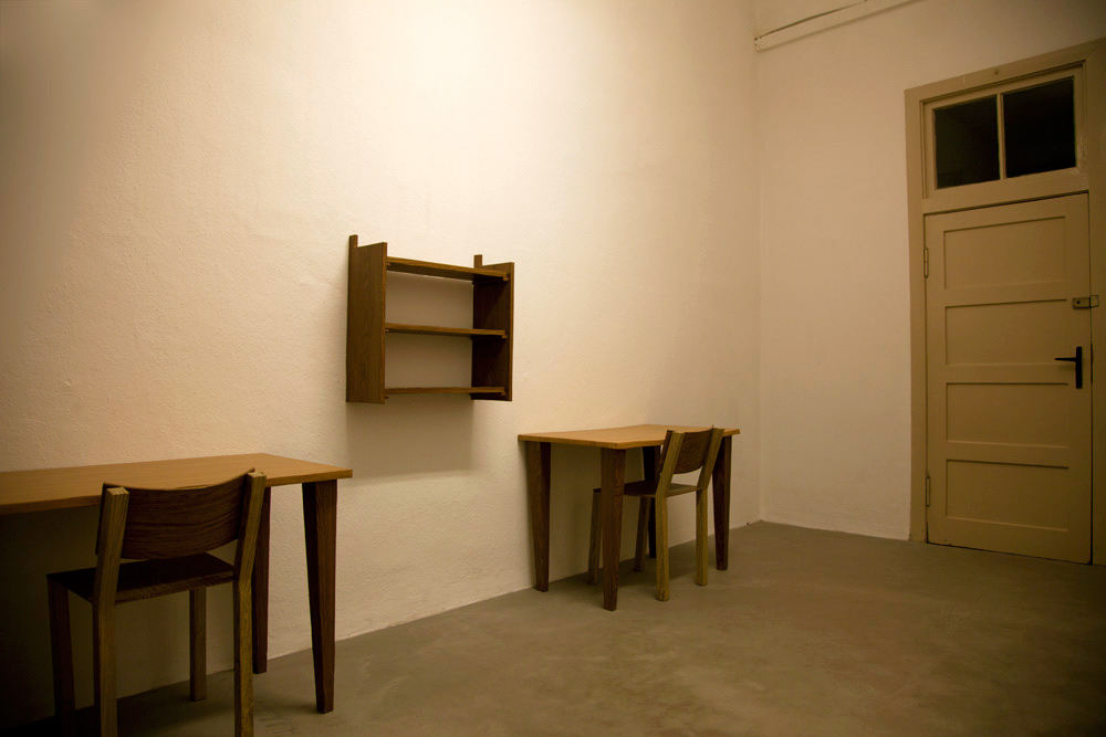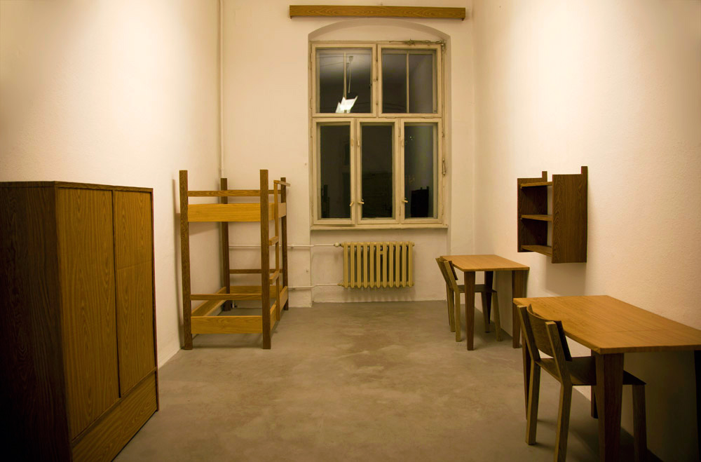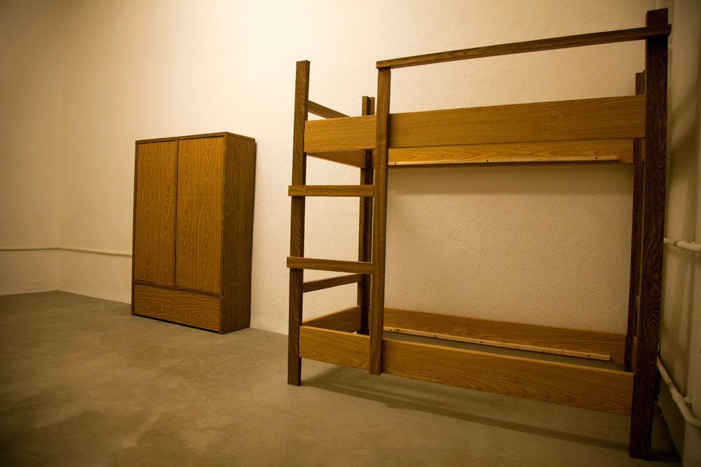 The installation takes place on the first floor of an old FDJ (Est german communist party youth organization) boarding room for children of the party's Elite, in Pankow (Berlin). The installation is a recreation of a boarding room as it might have been in the room's previous incarnation. The recreated furniture is made from cardboard and Vinyl sticky roll. Some construction assemblage is visible (hot glue, screws, tape). The furniture is made to come from East German origin, but fake, obviously made of cardboard. It is pretending to be something it is not, both a caricature and a familiar object. The room, bare of any personal information, is either about to be inhabited or was just emptied.