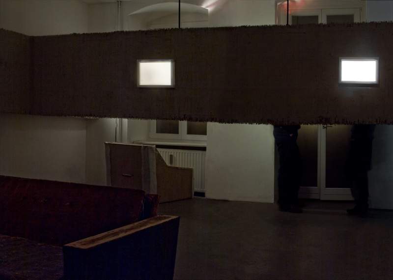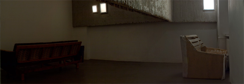 Multiplying the tenses was the third installement in the series. A built in wall section, made of straw and cement, divided the exhibition space in two. By crawling under the wall the visitors could be in one of two living room. Each living room had stripped furniture and lit empty frames on the wall.
