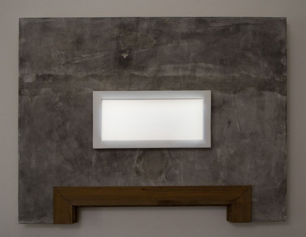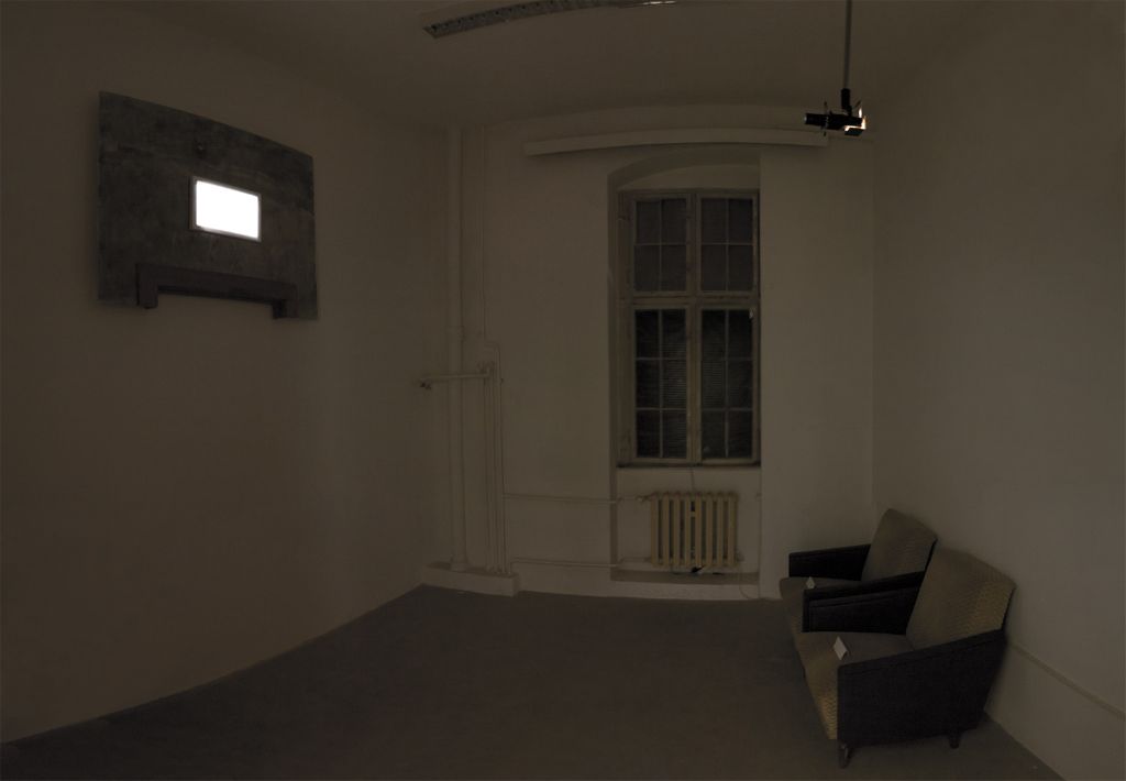 A dark room, two chairs on one side, with blank paper signs, to discourage sitting down. Above the chairs a light. Opposite the chairs, attached high on the wall is a raised wall section. An electrical line can be seen running within the unfinished cement wall. In the center of the wall a white frame is lit within. A picture of a president, a dictator, or someone important might have been (or will be) there. At the bottom of the wall section, the top of a door frame is visible, the wood is unfinished.